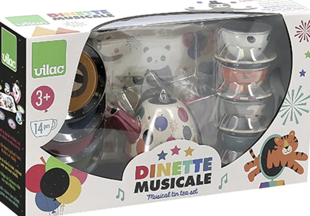 Kopper, underkopper og de 4 tallerkner passer sammen i sæt sammen med tekanden og serveringsbakken. Alle dele er illustreret med cirkustema som for eksempel en panda, en tiger, en koalabjørn og et dovendyr, som optræder i en cirkusforestilling.