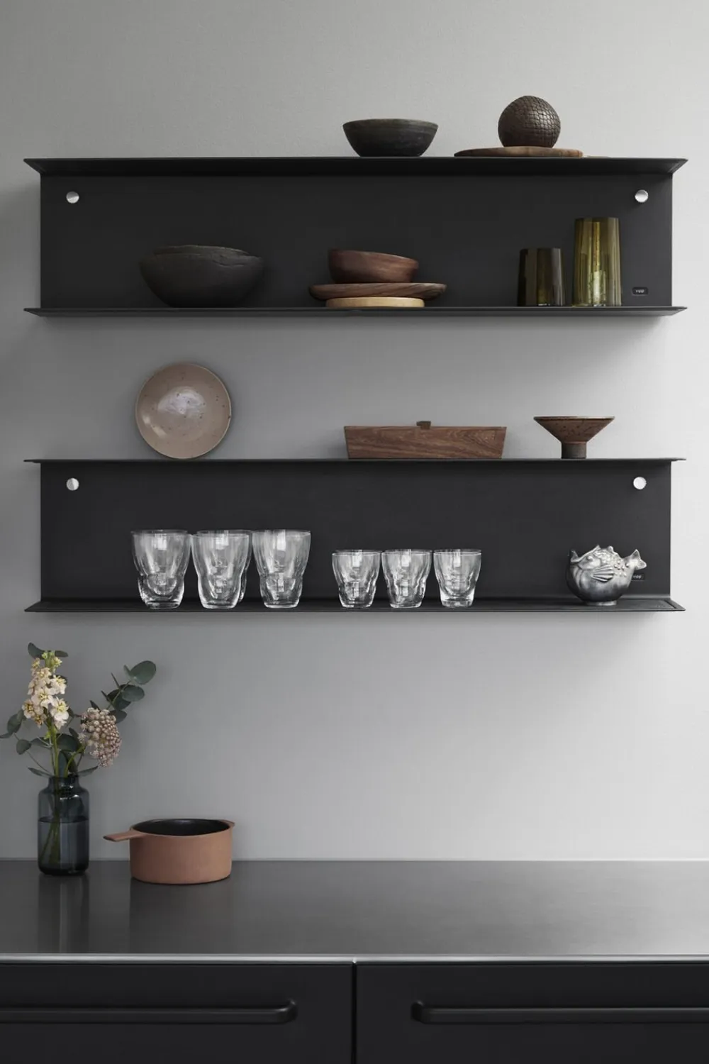 Denne Vipp922 hylde er en funktionel opbevaringsløsning til badeværelset, køkkenet, soveværelset eller kontoret. Hylden monteres med et usynligt beslag. De CNC-fræsede fingerskruer er specialdesignet af Vipp i børstet rustfrit stål, og udgør både en subtil detalje i hyldens funktion og design. En fordybning i hyldens nederste flade er udstyret med en silikonemåtte for at skåne glas og porcelæn. Ligesom køkken- og badmodulerne fås Vipp hylden i to størrelser i sort eller hvid pulverlakeret aluminium. Dette er den største af de to Vipp hylder.