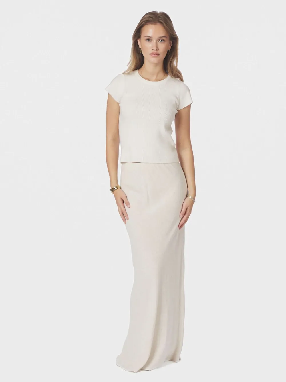 Lang nederdel i en viskose- og hørblanding. Nederdelen har skjult elastik i taljen og er skåret på skrå, så den falder flot. Den har en almindelig pasform. Modellen er iført størrelse 36.