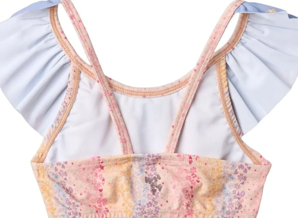 Skøn printet bikini med flæser til børn. – Overdel: Flæsekant foran, samt kryds bagpå med tynde stropper – Underdel: Flæsekant – Håndtegnet signaturprint Denne bikini er perfekt til en varm dag på stranden, ved poolen, vandleg i haven eller i svømmehallen. Bikinien har skønne flæser på både over- og underdel i kontrastfarve. Al badetøj er overvejende produceret i genanvendt polyester, og er Standard 100 fra OEKO-TEX® certificeret. Forlæng dit badetøjs levetid: – Ved altid at skylle dit badetøj efter badning i klor- eller saltvand. – Ved at følge vaskeanvisningerne — – Standard 100 fra OEKO-TEX® – 83% Genanvendt polyester, 17% Elastan – GRS certificeretNydelig bikini med print og volanger for barn. – Tettsittende passform – Bred volang ved utringningen – Strikk i livet med volang – Wheat-signaturprint Wheats badetøy er perfekt for en dag på stranden eller i svømmehallen. Alt vårt badetøy er hovedsakelig laget av resirkulert polyester, og er behagelig for barnet å ha på og lett å bevege seg i. Bikinioverdelen har en bred volang langs halsutringningen. Bikinitrusen har volang i midjen og elastisk linning. Slik tar du vare på badetøyet ditt: – Skyll alltid badetøyet etter bruk i klor- eller saltvann – Følg vaskeanvisningen — – Standard 100 by OEKO-TEX® – 83% Resirkulert polyester, 17% Elastan – GRS-sertifisert