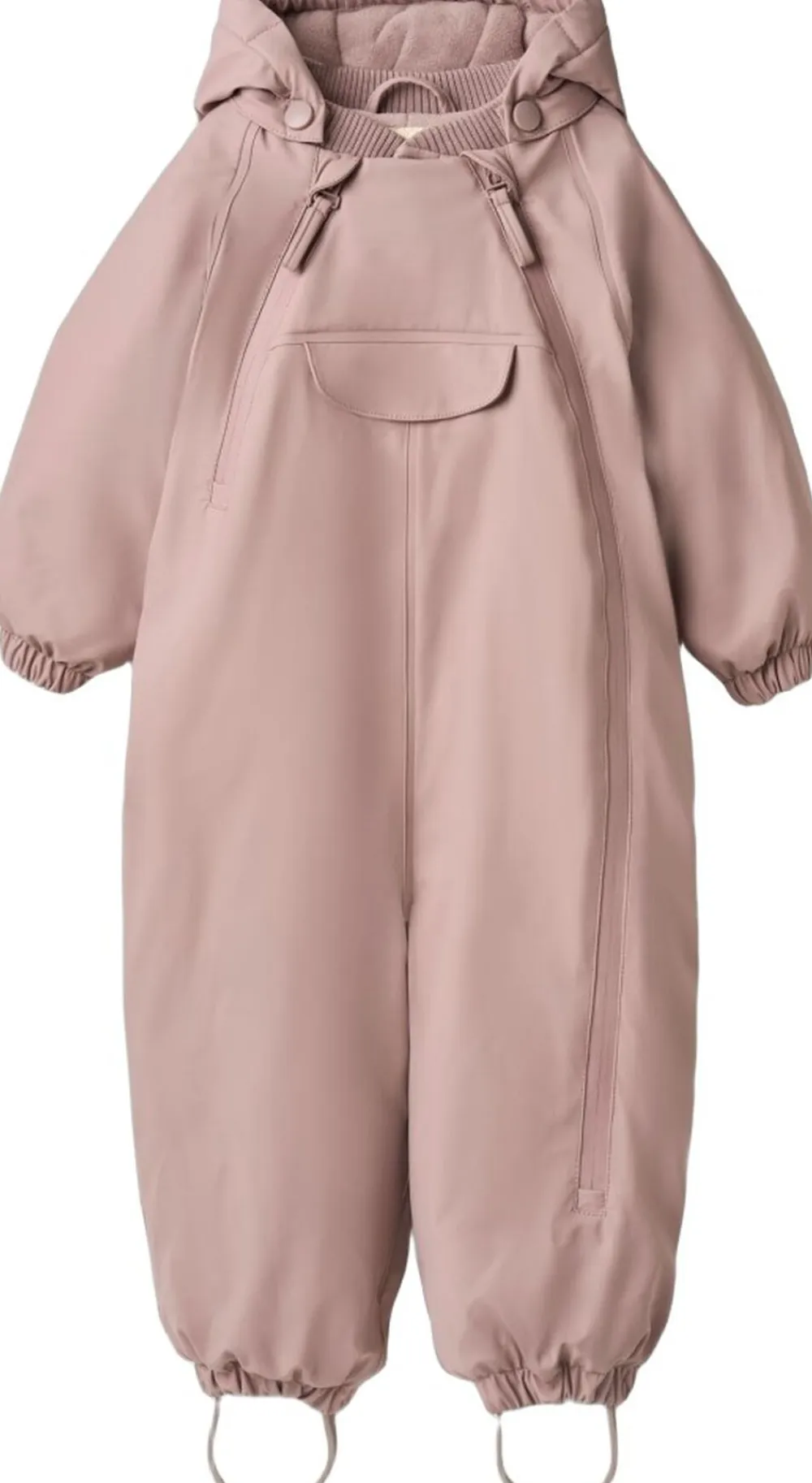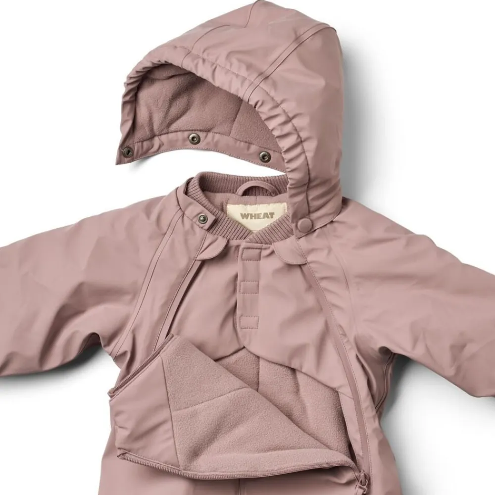 Skøn og uundværlig flyverdragt i vandtæt materiale til din baby. – Normal pasform – Aftagelig og justerbar hætte – Ribkrave – Dobbelt vindstolpe med vandtætte lynlåse – Lomme på brystkassen – Aftagelige gummistropper under fødderne – Elastik i manchetter og i benene, der lukker tæt – Reflekser Wheat’s PU dragter er en perfekt blanding mellem den velkendte regndragt og en flyverdragt. Denne dragt har en tykkere vinter polstring, som gør den varm på selv de koldeste og vådeste vinterdage. Vinterdragten er lavet i åndbart polyurethan (PU) materiale og er derfor unik, da den kan holde dit barn både tørt og varmt på én og samme tid. Dragten har mange praktiske detaljer såsom aftagelig og justerbar hætte, ribkrave og dobbelt vindstolpe. Den ene lynlås kan åbnes fra hagen og hele vejen ned til anklen. Lynlåsen i højre side kan åbnes til midt på brystkassen. Indvendigt er der en lukning over brystet med velcro, som støtter og holder dragten på plads. — Vandsøjletryk: 9. 000 mm Åndbarhed: 600 g/m2/24 t PFC-fri Florin-fri (BIONIC-FINISH® ECO) Vandtætte lynlåse Alle sømme er vandtætte og forseglet — Standard 100 by OEKO-TEX® Yder materiale: 100% Genanvendt polyester i åndbar PU (polyurethan belægning) Isolering: 100% Genanvendt polyester For: 100% Genanvendt polyester