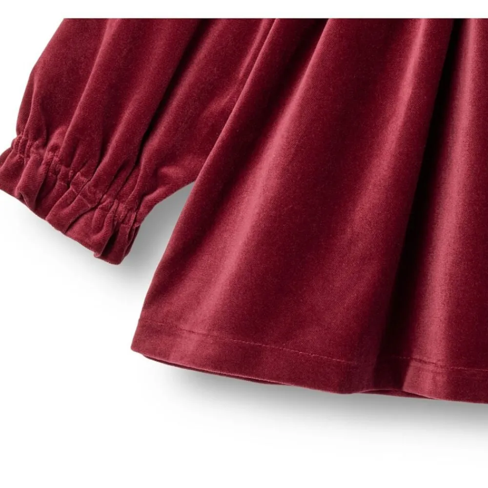Langærmet julekjole i blødt økologisk bomuldsfløjl til din baby. – Løs pasform – Længde: Over knæene – Skæring over brystet med rynk og vidde nedenfor – Knaplukning bagpå Wheats charmerende julekjole i blødt fløjl er skabt til at sprede magisk julestemning. Med sin luftige pasform er den både let og behagelig for dit barn at have på hele dagen. De fine rynk detaljer over brystet tilføjer et strejf af volumen i skørtet, mens knaplukningen bagpå gør det nemt for dit barn at hoppe i kjolen. Perfekt at style med strømpebukser og en fin basis body under på de køligere dage klar til både festlige øjeblikke og hverdagsmagi. — – 100% Økologisk bomuld – GOTS certificeret