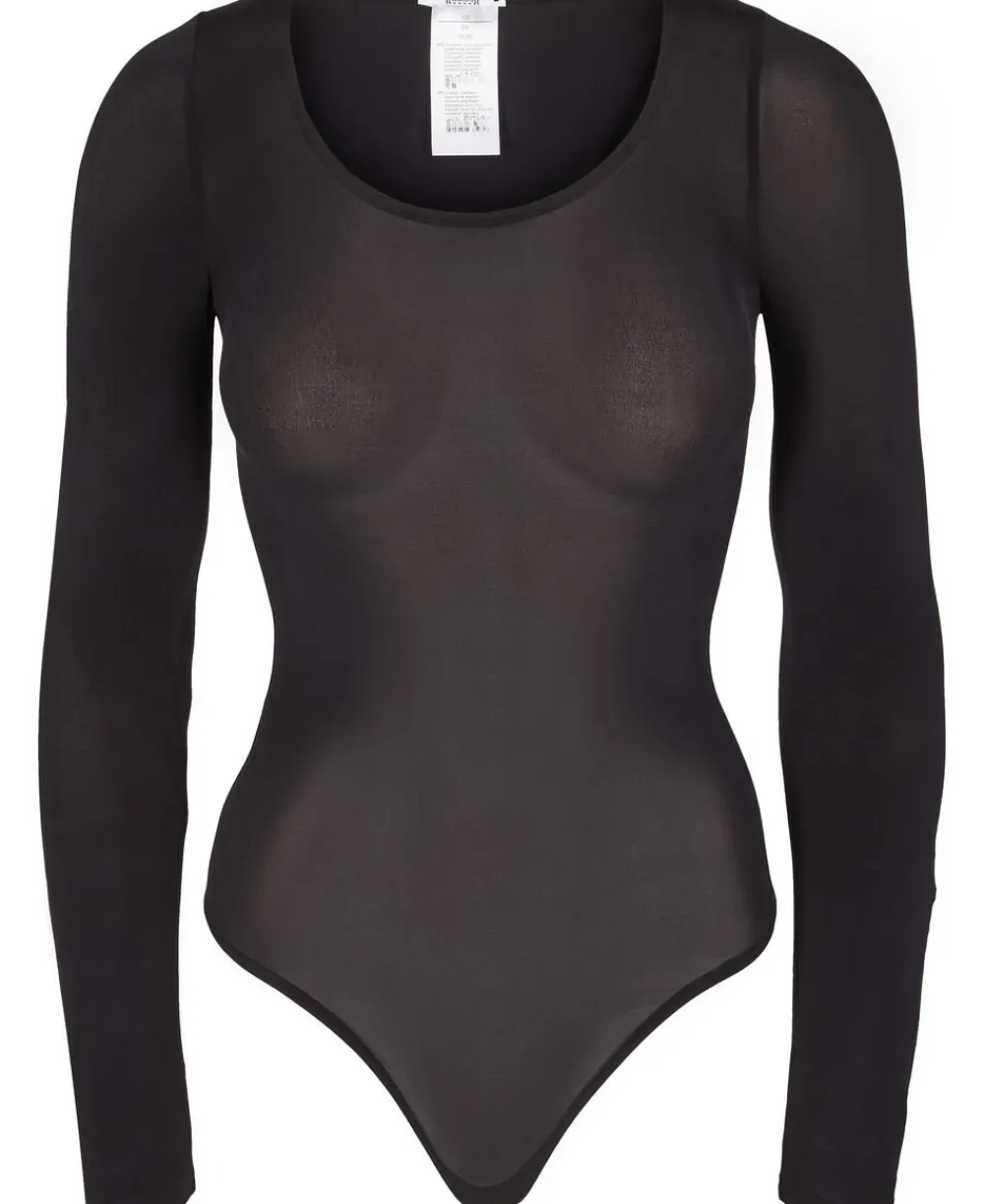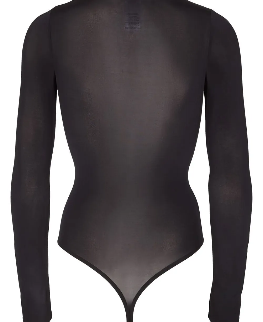 Body fra Wolford i en silkeblød kvalitet med en god elasticitet og et let transparent udtryk. Bodyen har lange ærmer, en rund halsudskæring samt en G-strengskile med trykknapslukning. En ultrafeminin body, som er ideel i basisgarderoben.