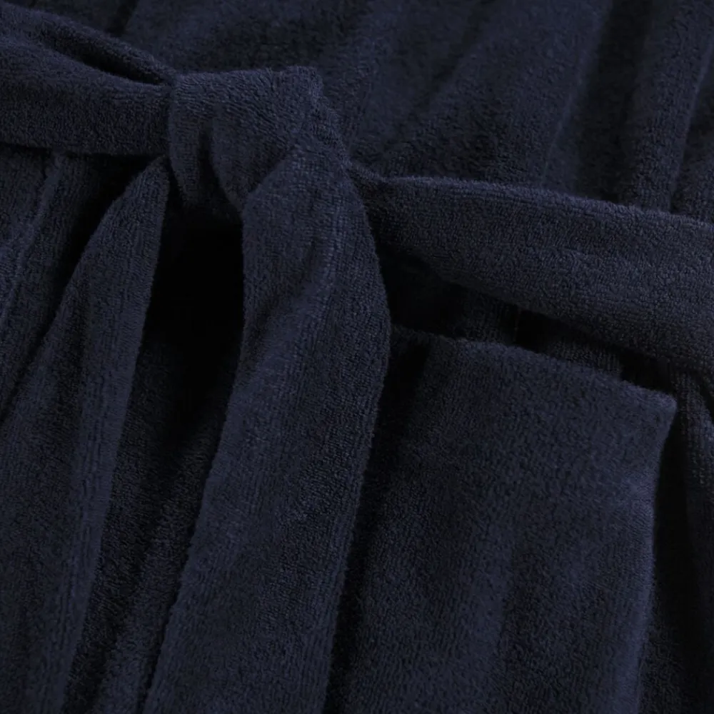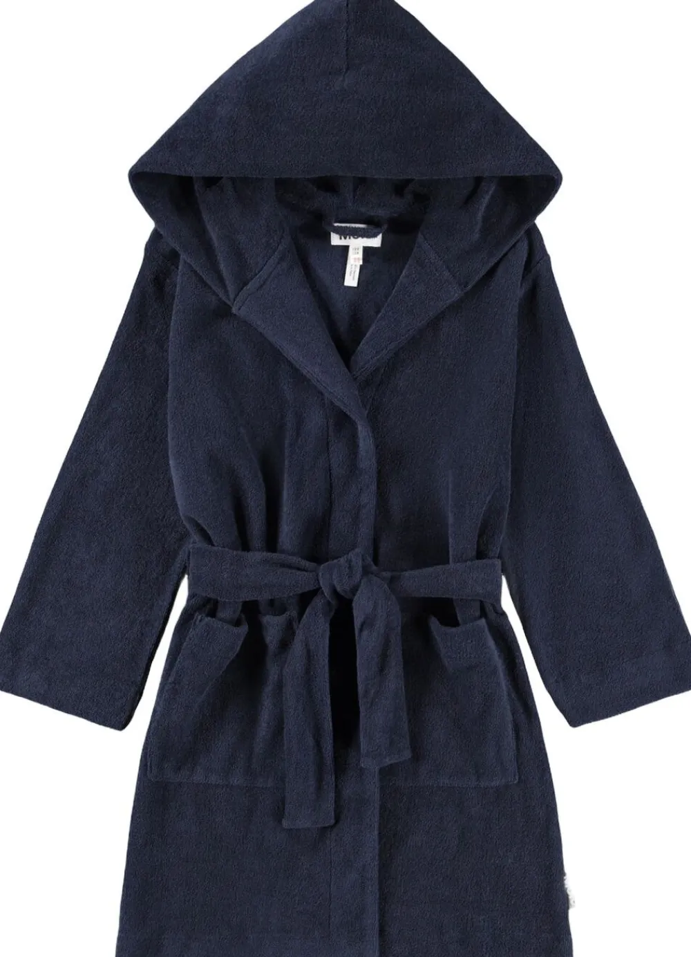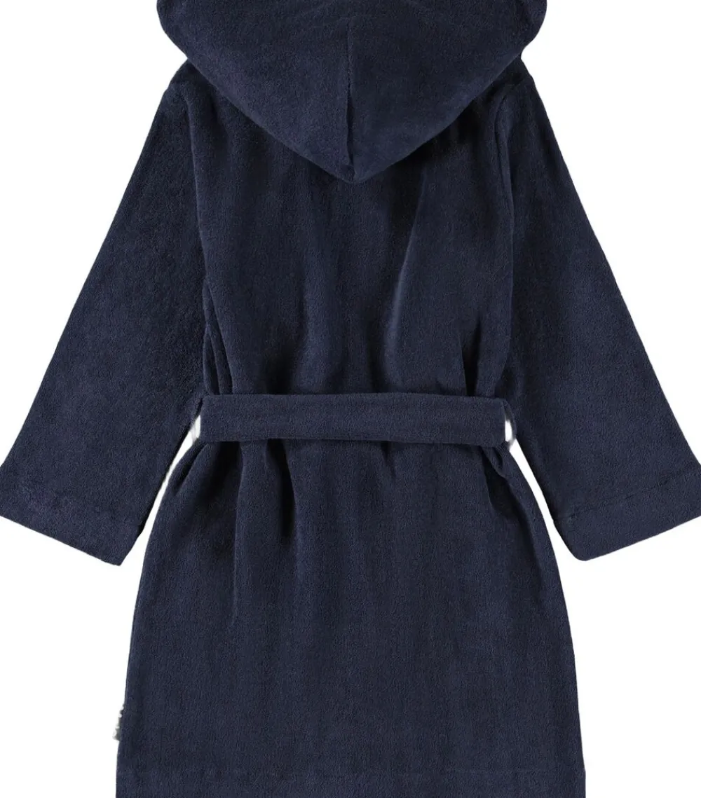 Blå badekåbe fra Molo i superblød økologisk bomuldsfrotté med to lommer, bindebånd i taljen og en hætte.