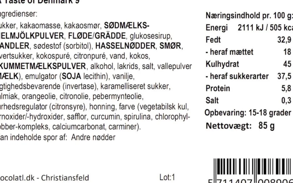 chokolade med saltkaramel, hvid chokolade med citronfromage, mælkechokolade med nougat, mælkechokolade med