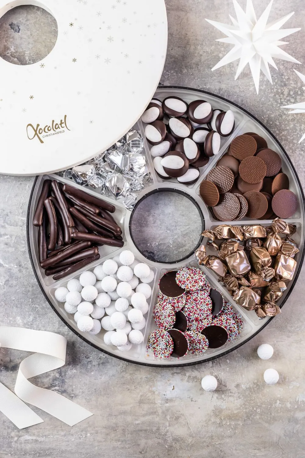 chokolade og sukkerskal samt fyldte chokolader med nougat og karamel