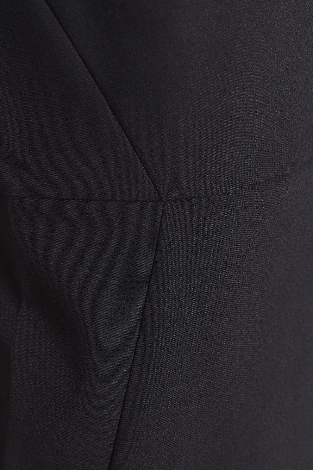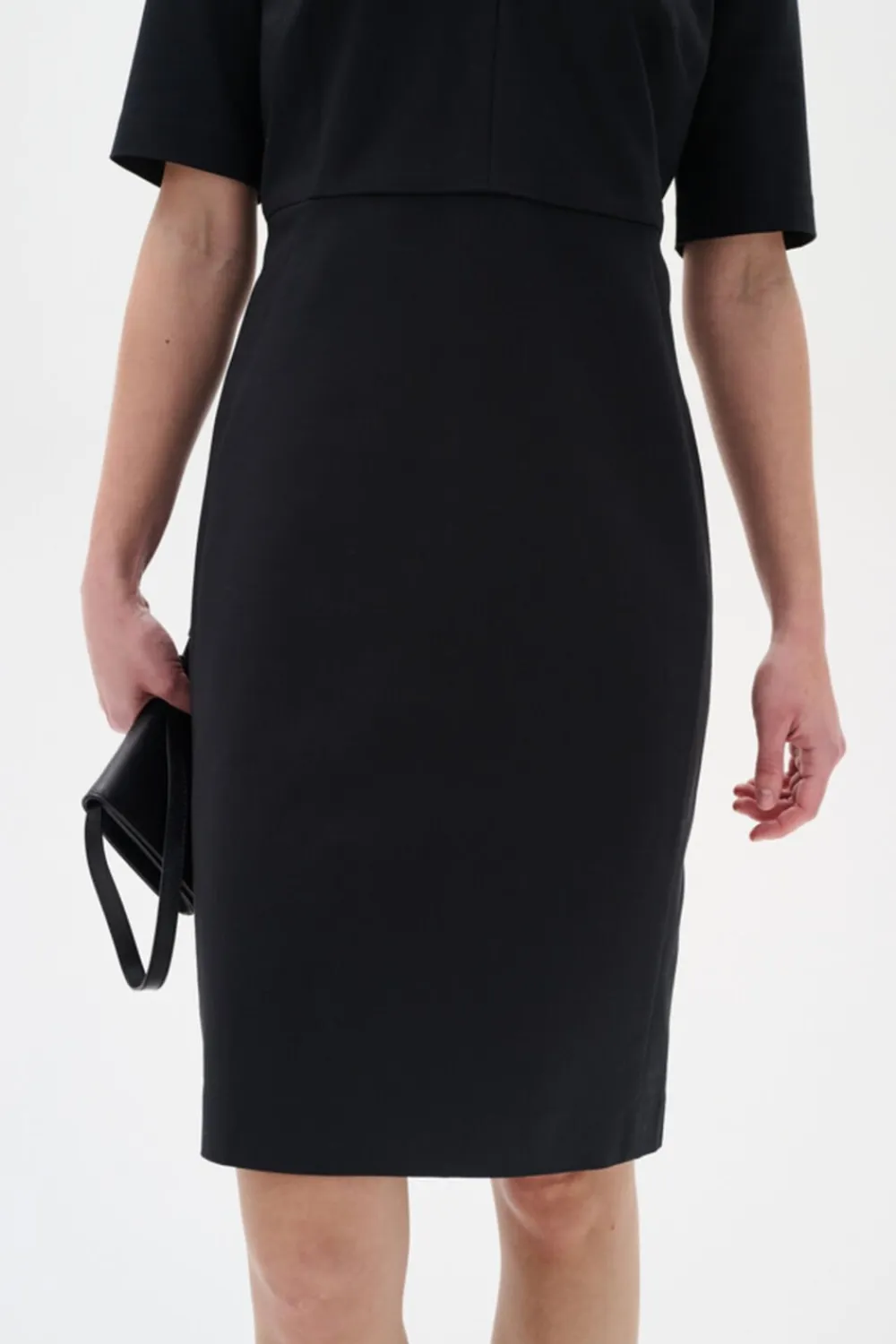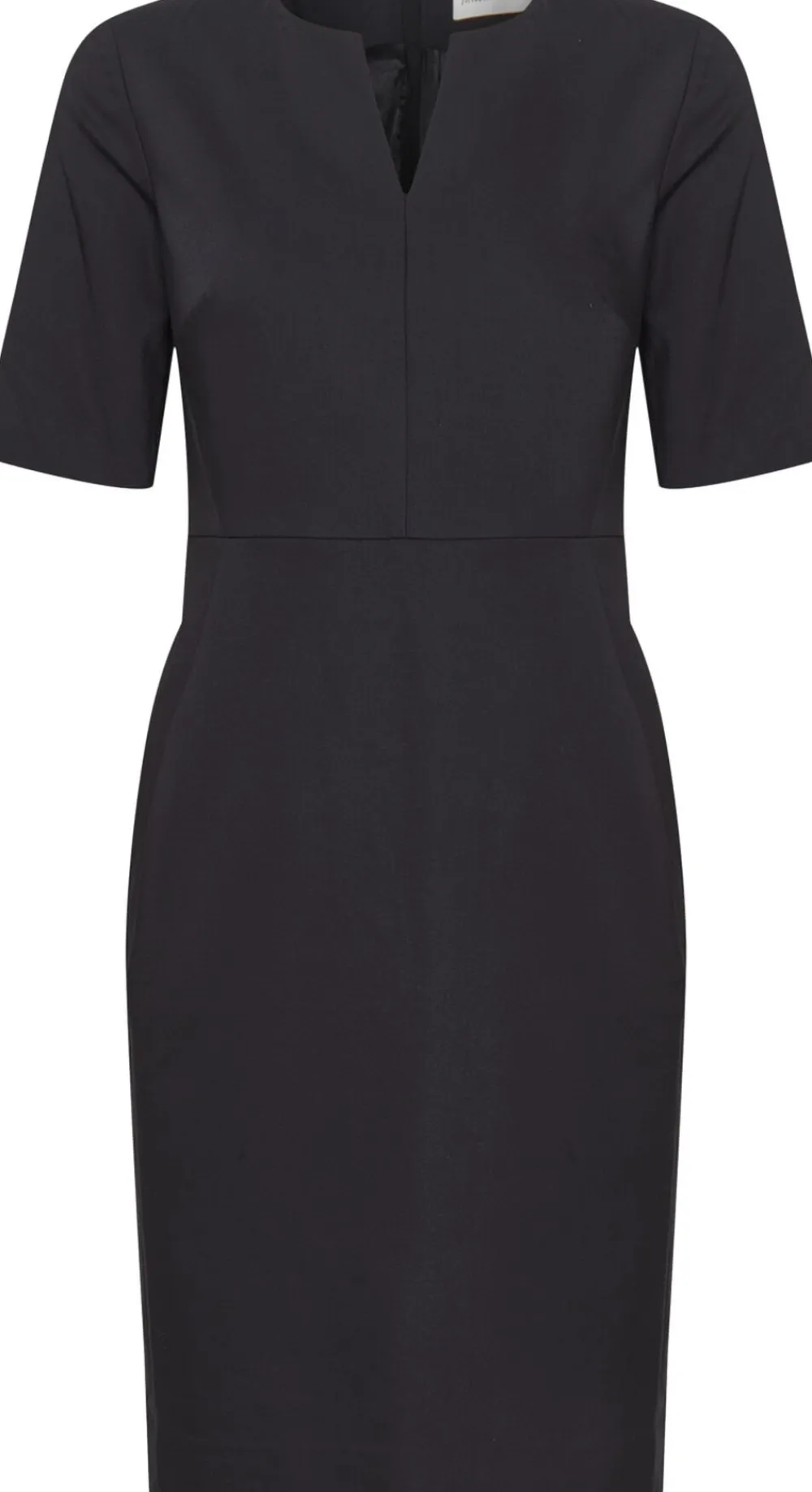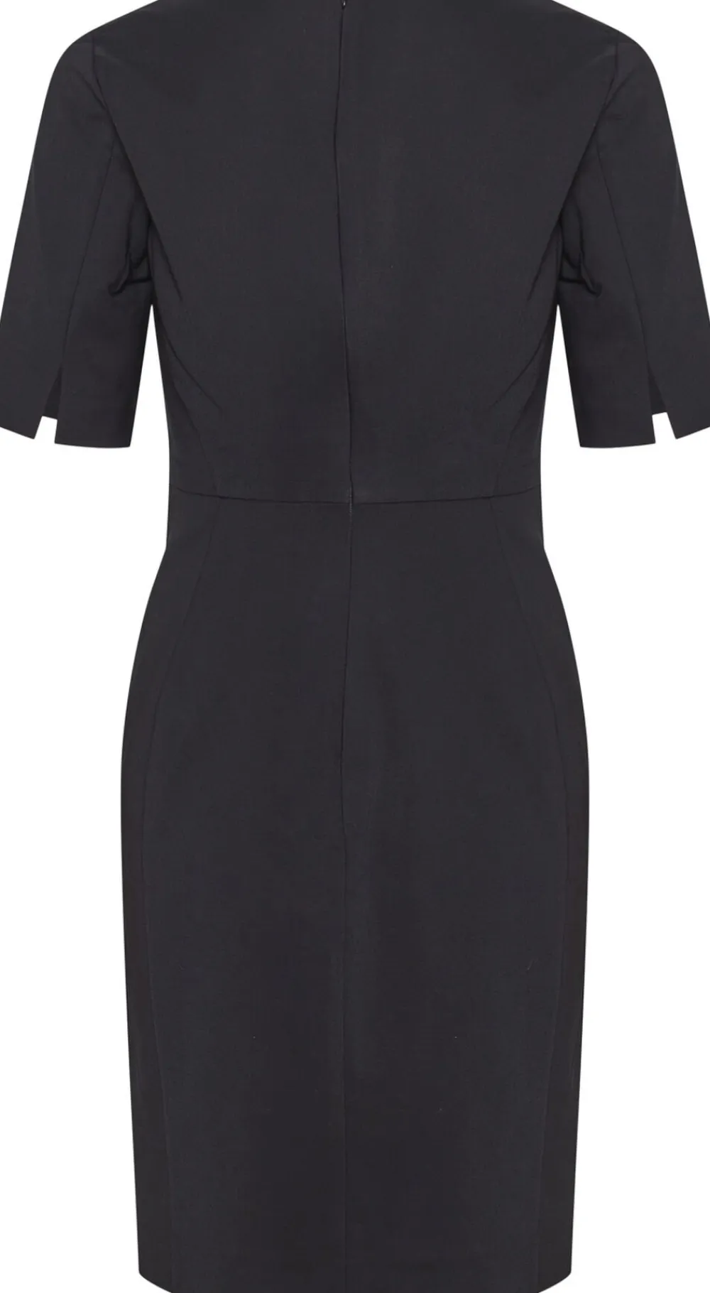 Knælang figursyet kjole med V-udskæring, korte ærmer og slids bagpå. Skjult lynlås i ryggen og regulær pasform gør den velegnet til både arbejde og arrangementer.