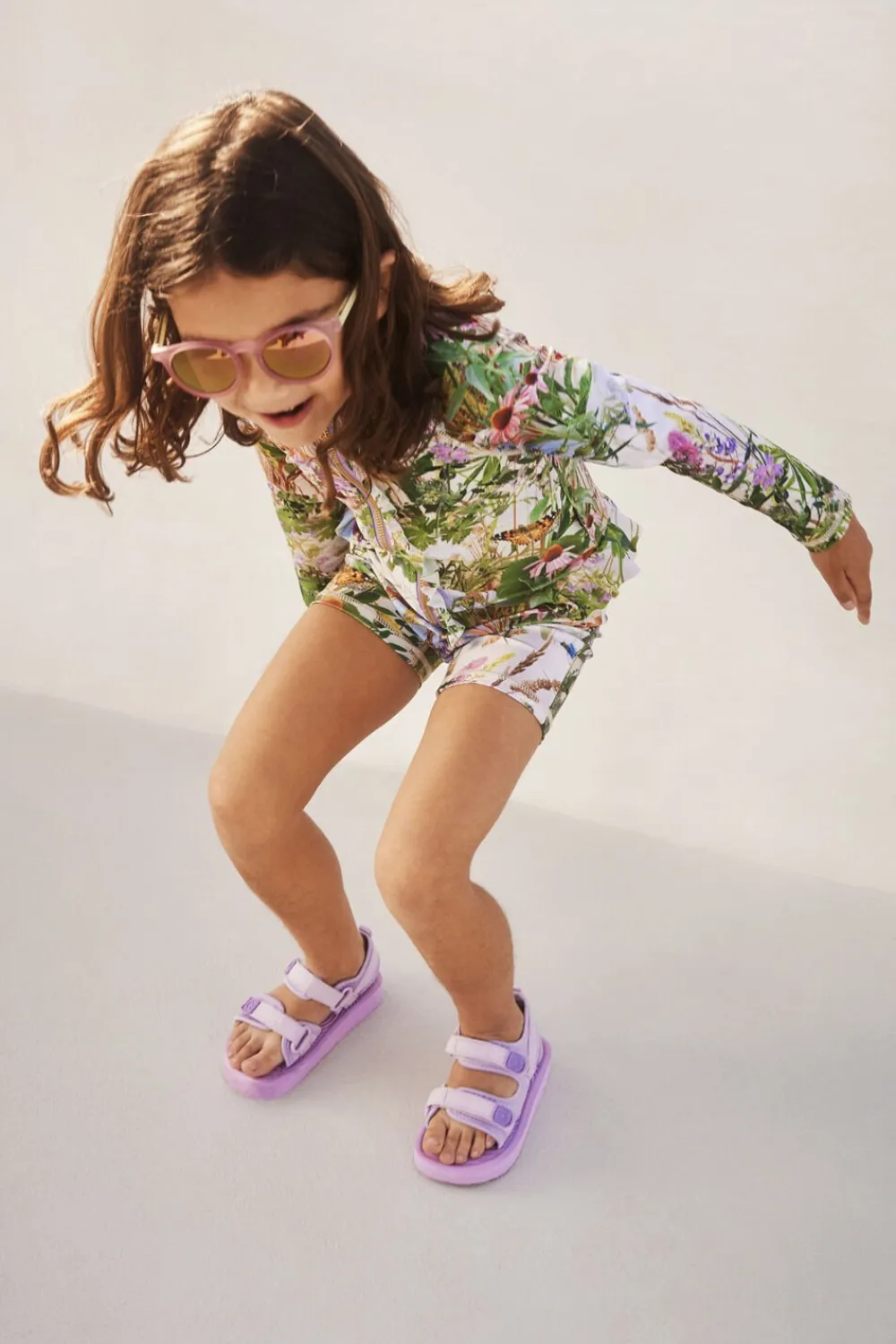 Lette og sporty lilla sandaler med en blød skumsål. Sandalerne er udstyret med komfortable neoprenpaneler, der sikrer foden, samt praktiske velcrolukninger ved anklen og over forfoden, hvilket gør dem nemme at tage af og på.