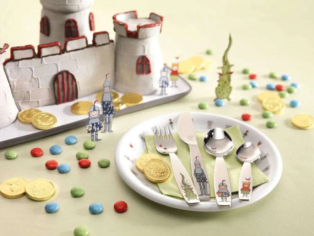 Spisebestikket i fire dele til børn fra Eckbert serien er perfekt til små hænder, som prøver kræfter med en kniv, gaffel og ske for første gang. For at gøre det til en sjov oplevelse er bestiksættet dekoreret med sjove ridder-figurer.